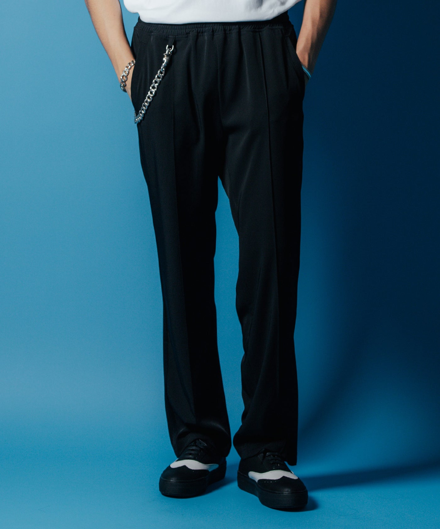 ではそのパンツは?と言いますと、まずは使用した生地にご注目いただきたい次第。落ち感とドレープが綺麗で、ほどよいハリもあるので薄っぺらにならない。まさに硬軟の塩梅が◎ このファブリックとの出会いで誕生したトラックパンツは正に”ありそうでなかった”の代名詞。暑い夏だろうと日々快適に穿くことができる優れものというワケです。かつ“ジャマイカンなルードボーイ”スタイルへのリスペクトも込め、ドレスアップしたコーデにもトラックパンツを合わせるような自由さを感じる、ヤーマンなスタイルを提案したいのが本音。