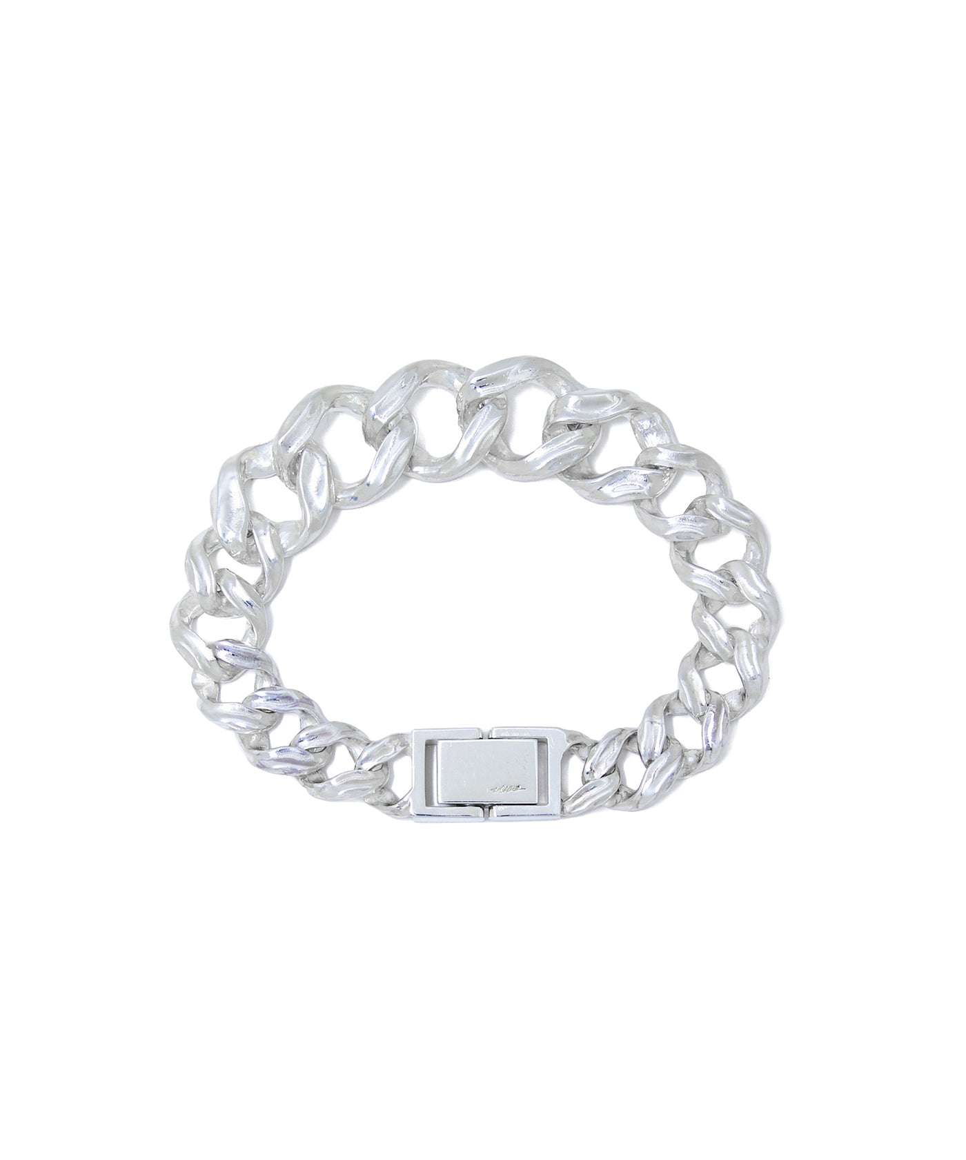 話を戻しますと、こんなルーツを持つブレスレットをTHE CRIMIEが見逃すワケもなく(笑)、男性が着けてカッコがつくのはもちろん、女性からも支持される様なデザインに仕上げたのがLINK CHAIN GRADATIONと命名された本モデル。名は体を示す通り喜平のコマサイズが中心に向かって徐々に大きくなる様がまるでグラデーションを描いているかのごとく表現された逸品。且つ、独特の“節”が無骨さを感じさせるのもポイントです。(余談ではありますが、アップルウォッチ用ブレスのプロトタイプになったのも本モデルだったりします。)そして、デザイナー最大のこだわりを詰め込んだのが留め具。片手で開閉できるイージーな操作性とともに、開閉時に出る「パチッ」という音色が、デザイナーの愛車のドアノブを閉める音色に酷似する様に仕上げてあるのです。その昔、デュポンのライターの開閉音にやられた方々なら、この意味、ご理解頂けるかと。マニアックさ満点ですが、好きな方には堪らないポイントです(笑)。