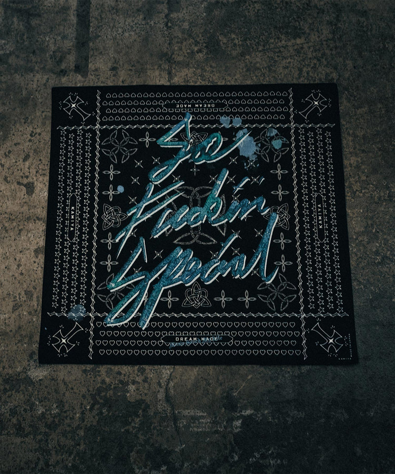 KAMIYAの肉厚なコットンのオリジナルバンダナにMSMLのオリジナルグラフィックを大胆にインクジェットプリントしたバンダナ。