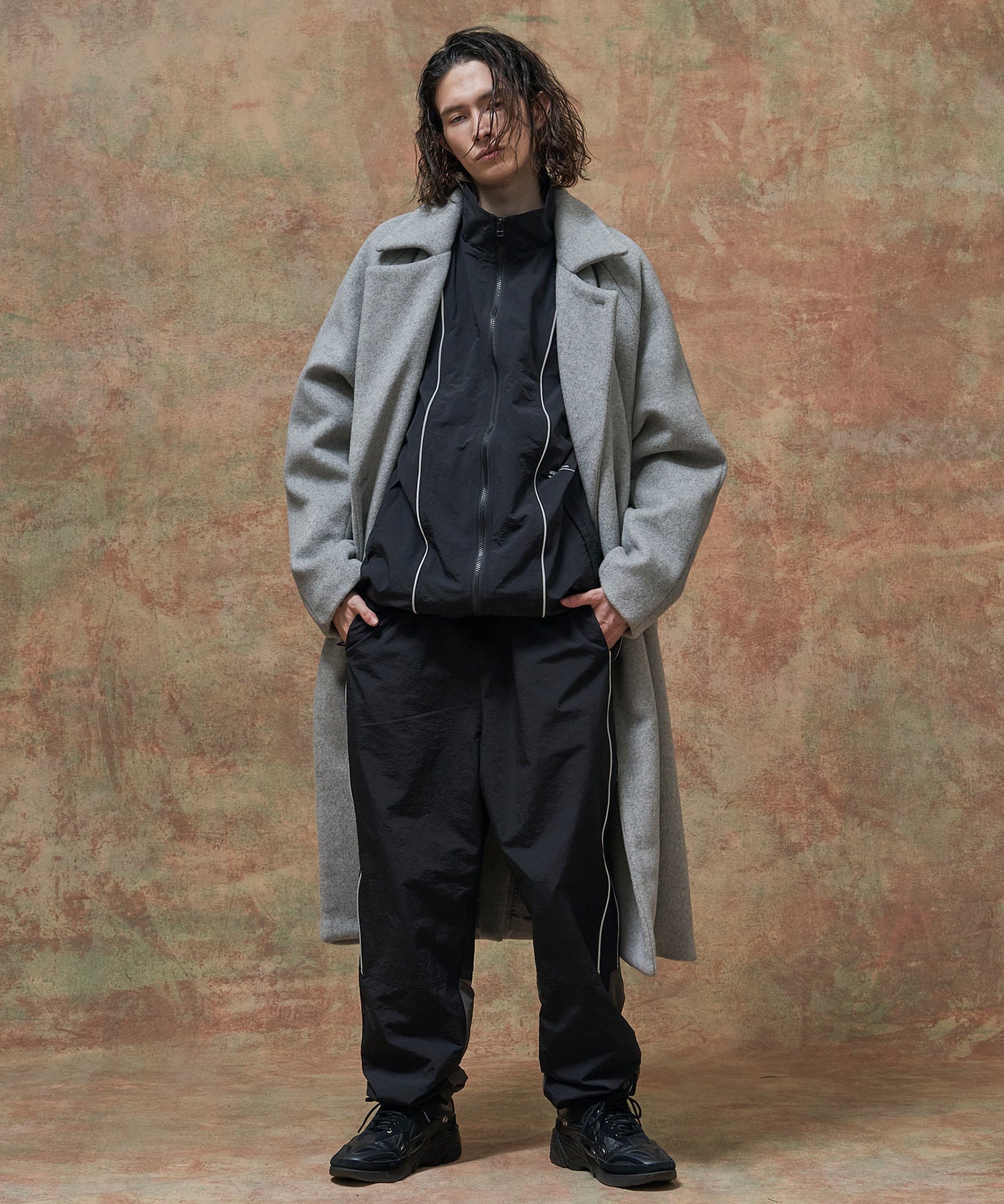 このセットアップをダブルブレストのウールのロングコートに合わせます。