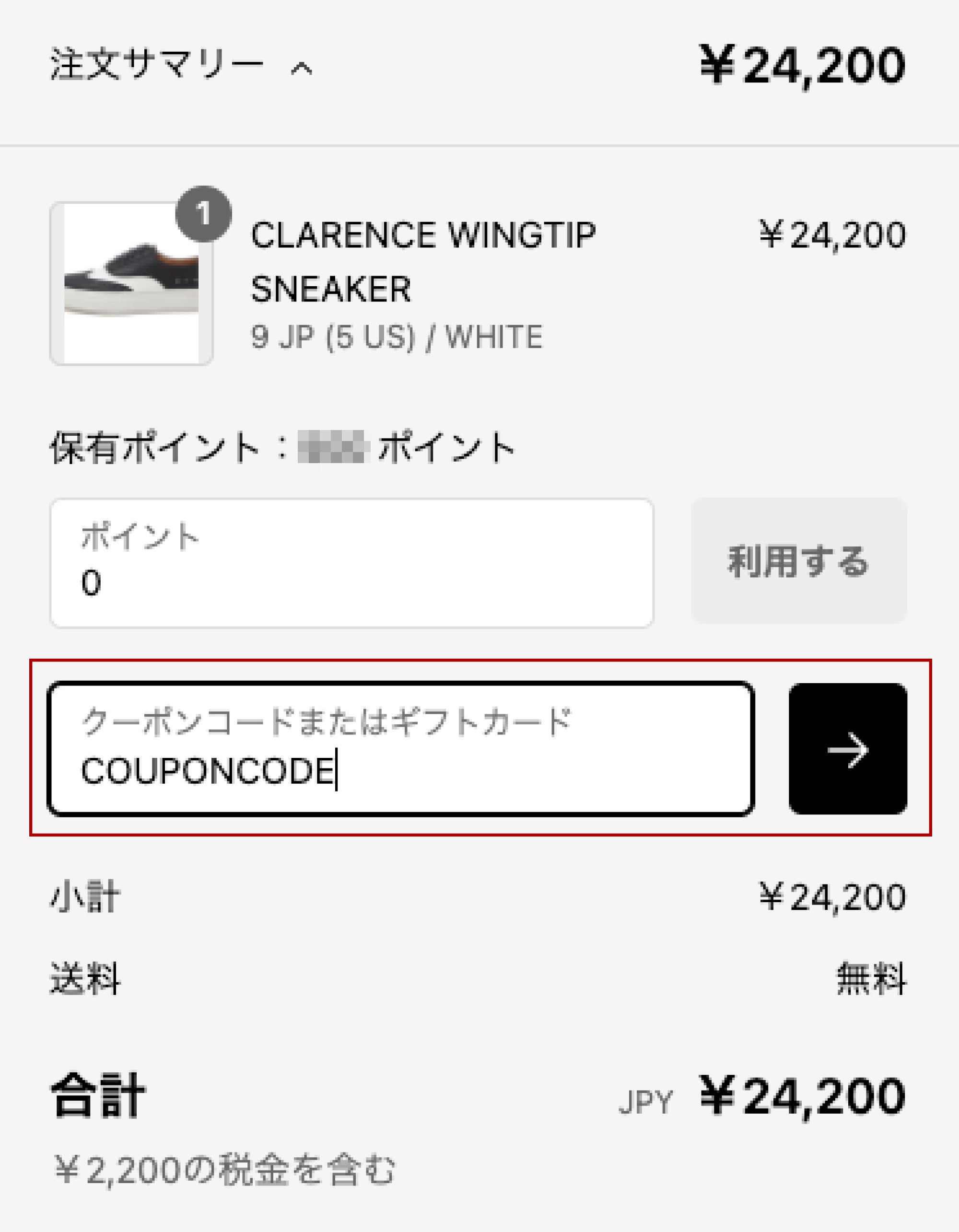 お好きな商品をカートに入れた後、チェックアウト画面の「クーポンコードまたはギフトカード」フォームに、先ほどコピーしたクーポンコードを記入し「適用」または「→」ボタンを押下します。