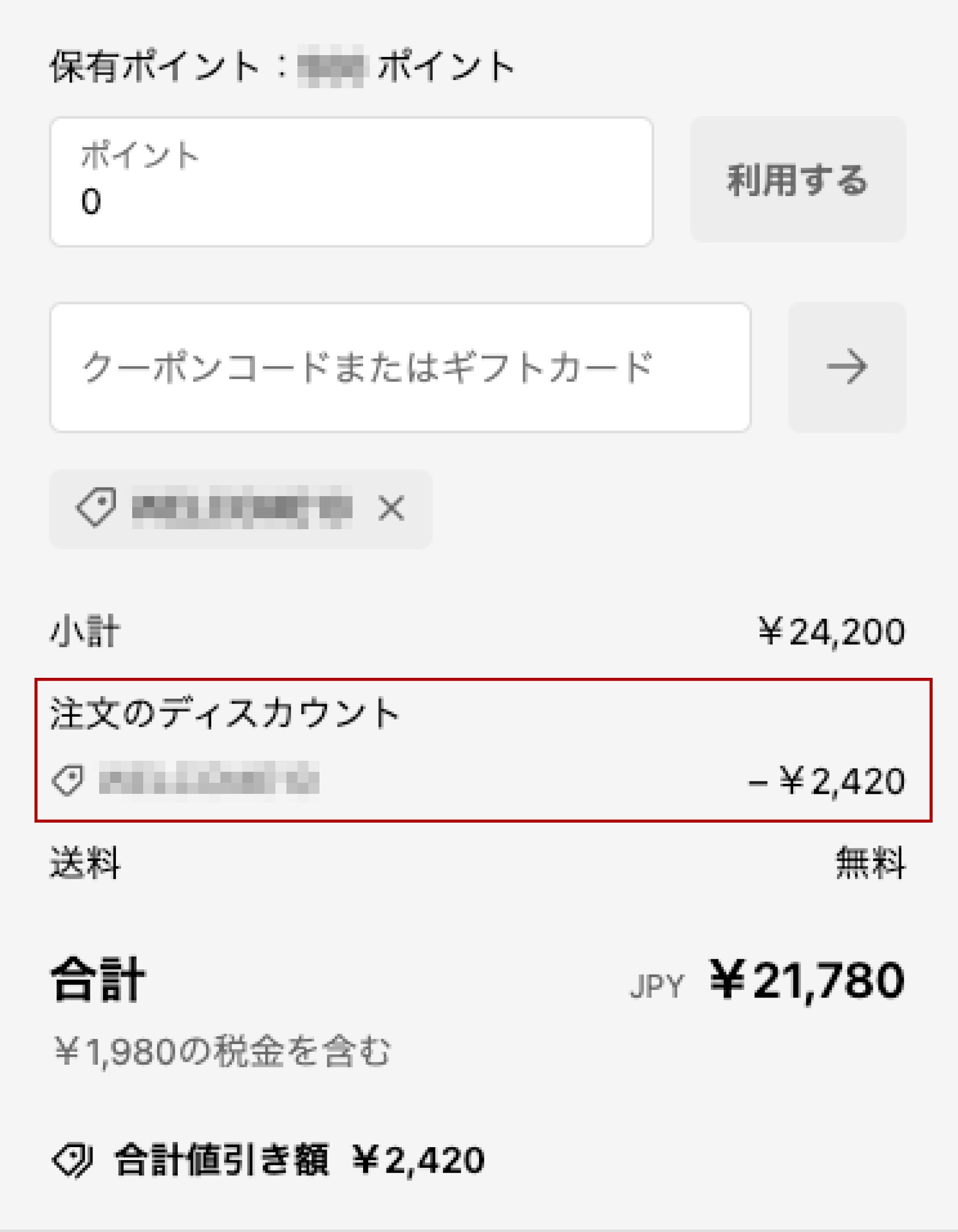 正しいクーポンコードが入力されると「注文のディスカウント」に割引金額が表示されます。